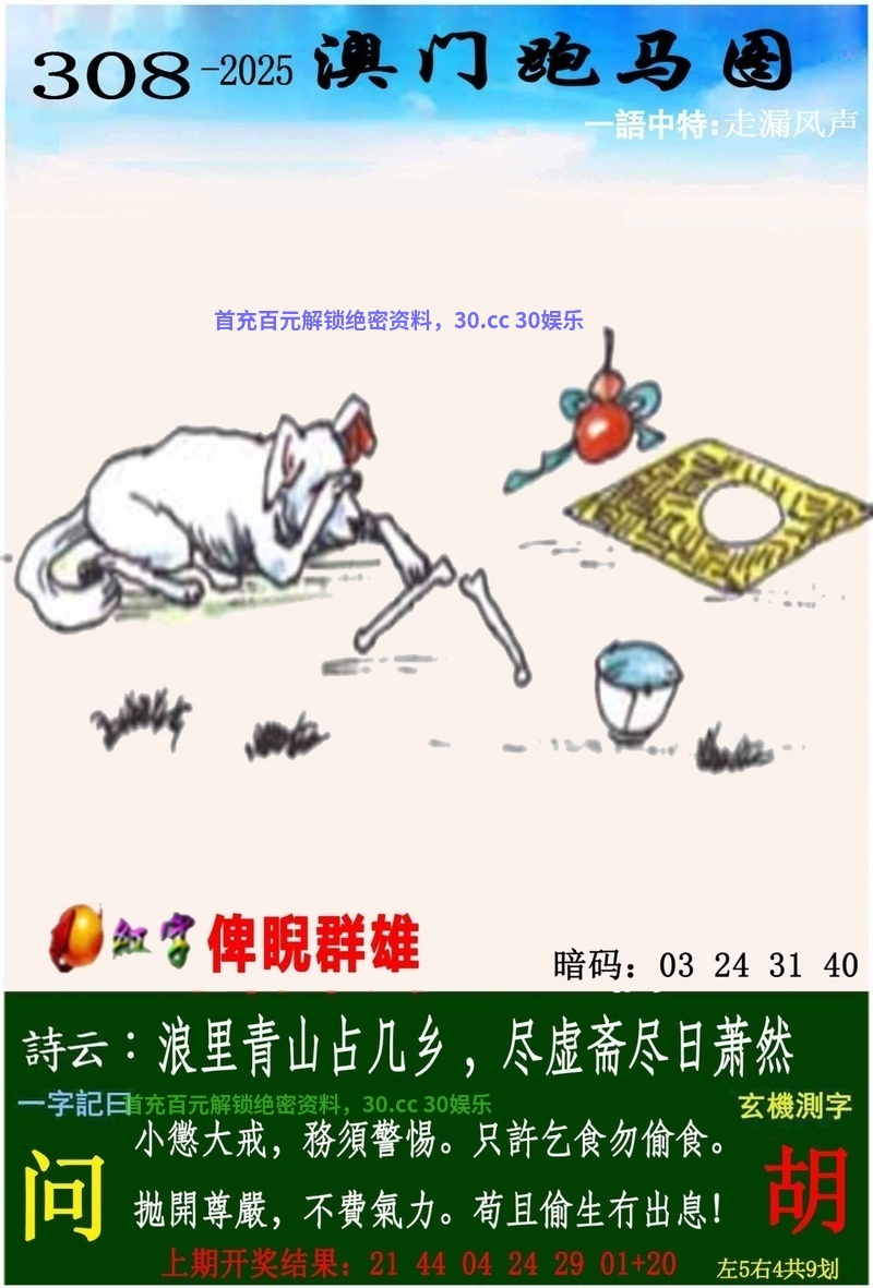 308期一字記曰:【问】小懲大戒,務須警惕。只許乞食勿偷食。拋開尊嚴,不費氣力。苟且偷生有出息!【胡】 解析:小懲大戒,務須警惕。只許乞食勿偷食。文官:龙猪羊兔鸡鼠 解特:龙猪羊兔鸡鼠 |