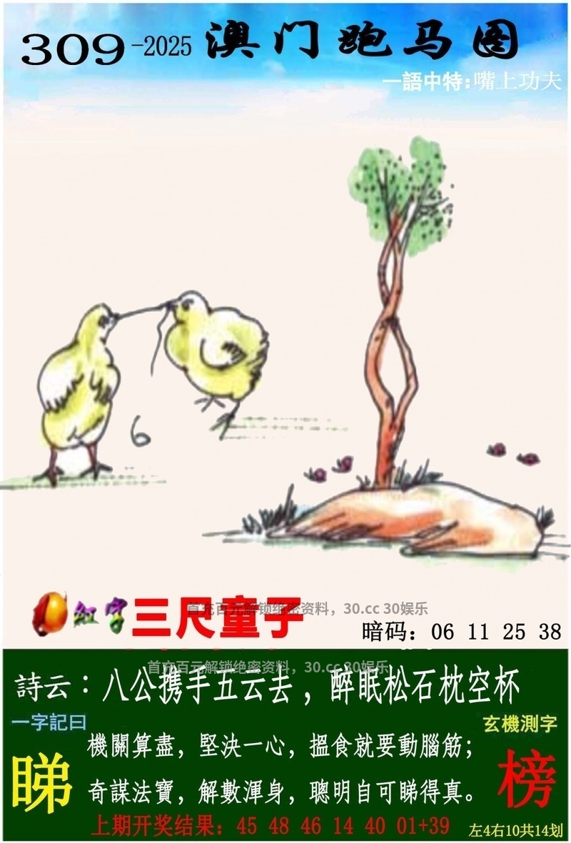 310期一字記曰:【暮】鶴壽千歲,松柏無疆,暮齡尚可翅開張;不怕年老,無謂風霜,彌堅之勇話鏗鏘。【畅】 解析:鶴壽千歲,松柏無疆,暮齡尚可翅開張;夜肖:虎鸡鼠猪牛狗 解特:虎鸡鼠猪牛狗 |